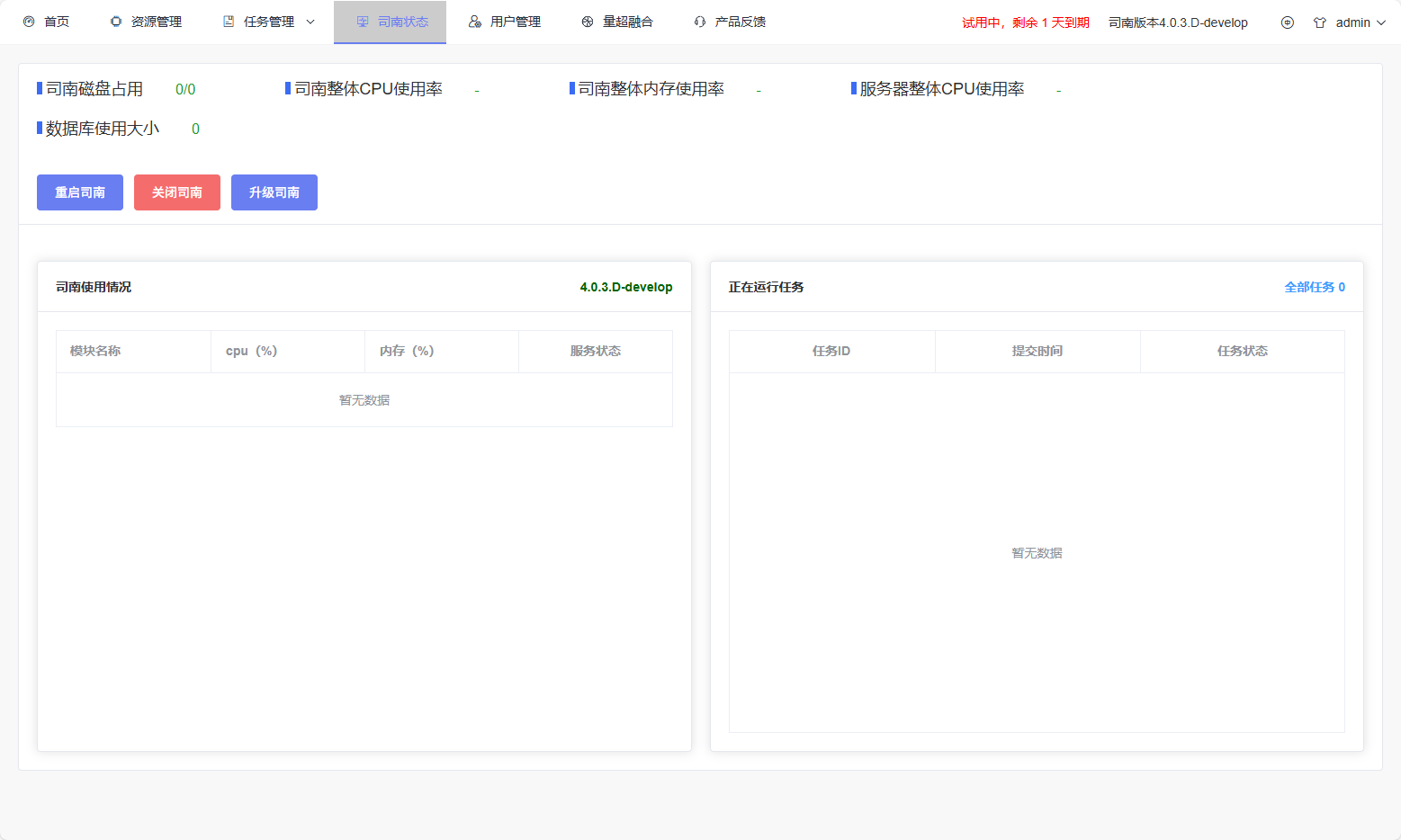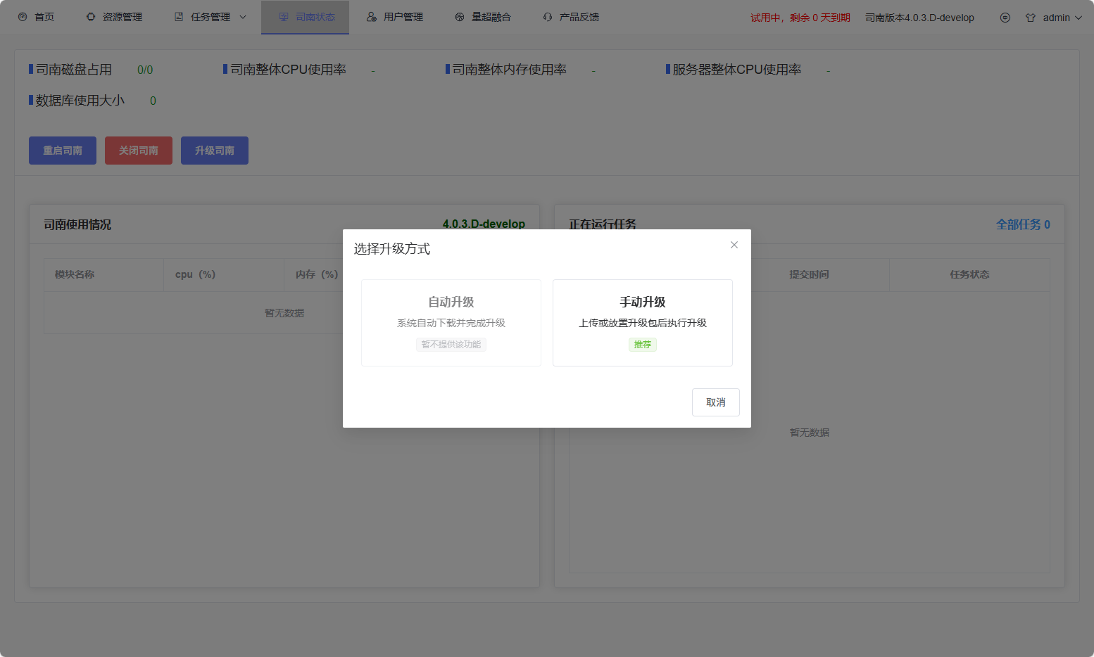 When users have administrator privileges, this area also provides Restart Sinan, Shutdown Sinan, and Upgrade Sinan options. Clicking the upgrade button allows access to the system version upgrade process (detailed explanation refers to the Upgrade Sinan function module in this section).