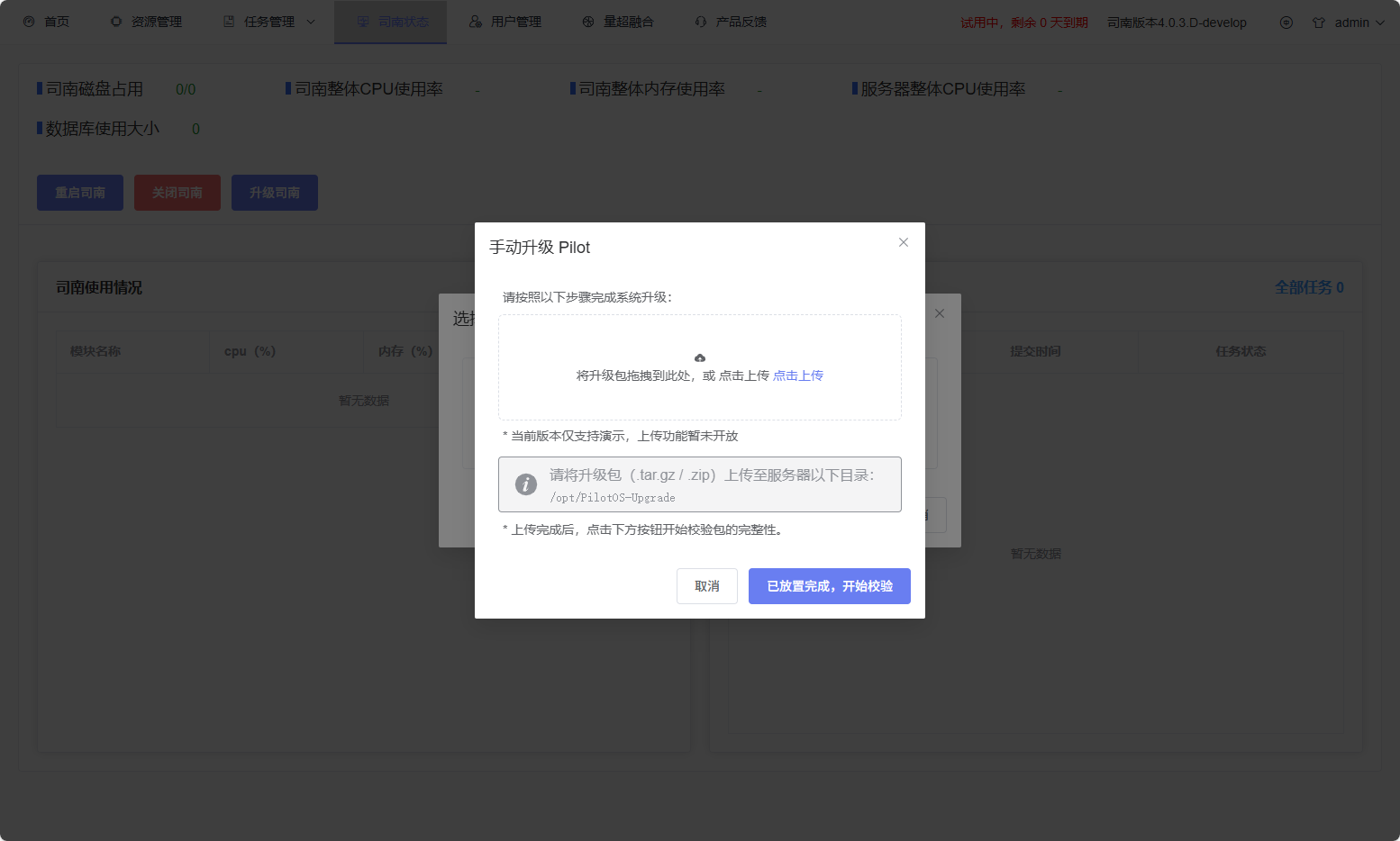 .tar.gz/.zip) in the server’s designated directory:/opt/PilotOS-Upgrade.Click the Placement Complete, Start Verification button, and the system automatically scans the upgrade package in the designated directory.