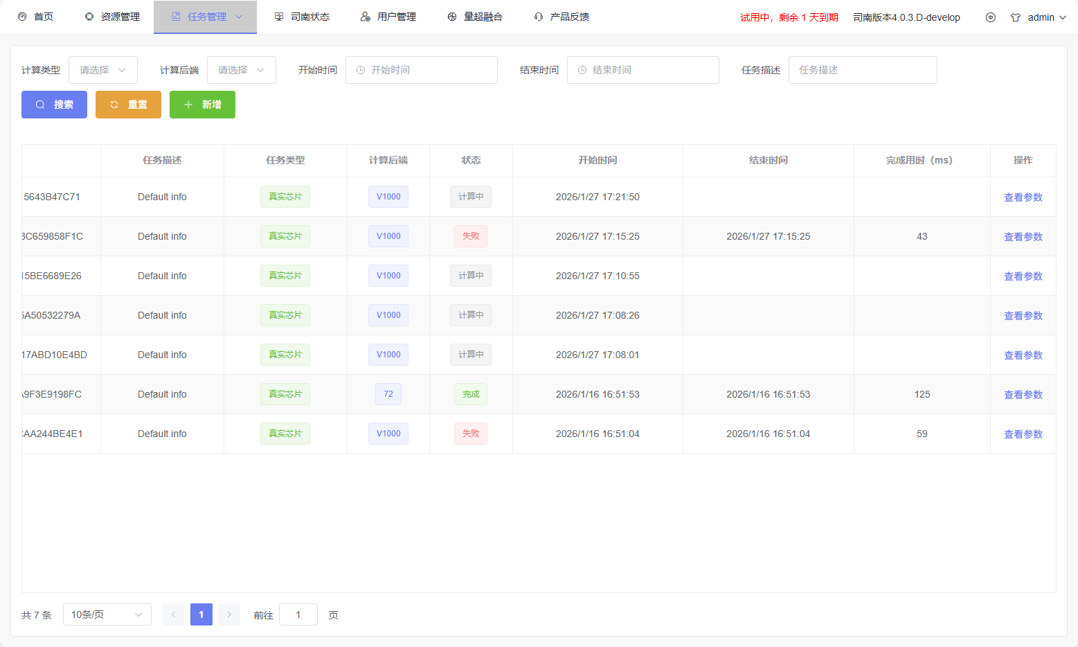 Task List Module (Main Area): Displays task information in table format, including: - Task ID: Click to enter task details page; - Task Description - Task Type - Computing Backend - Task Status: such as Running, Completed, Failed; - Start Time, End Time, and Total Duration - Operations: Click View Parameters to navigate to the task submission page to view submission configuration.