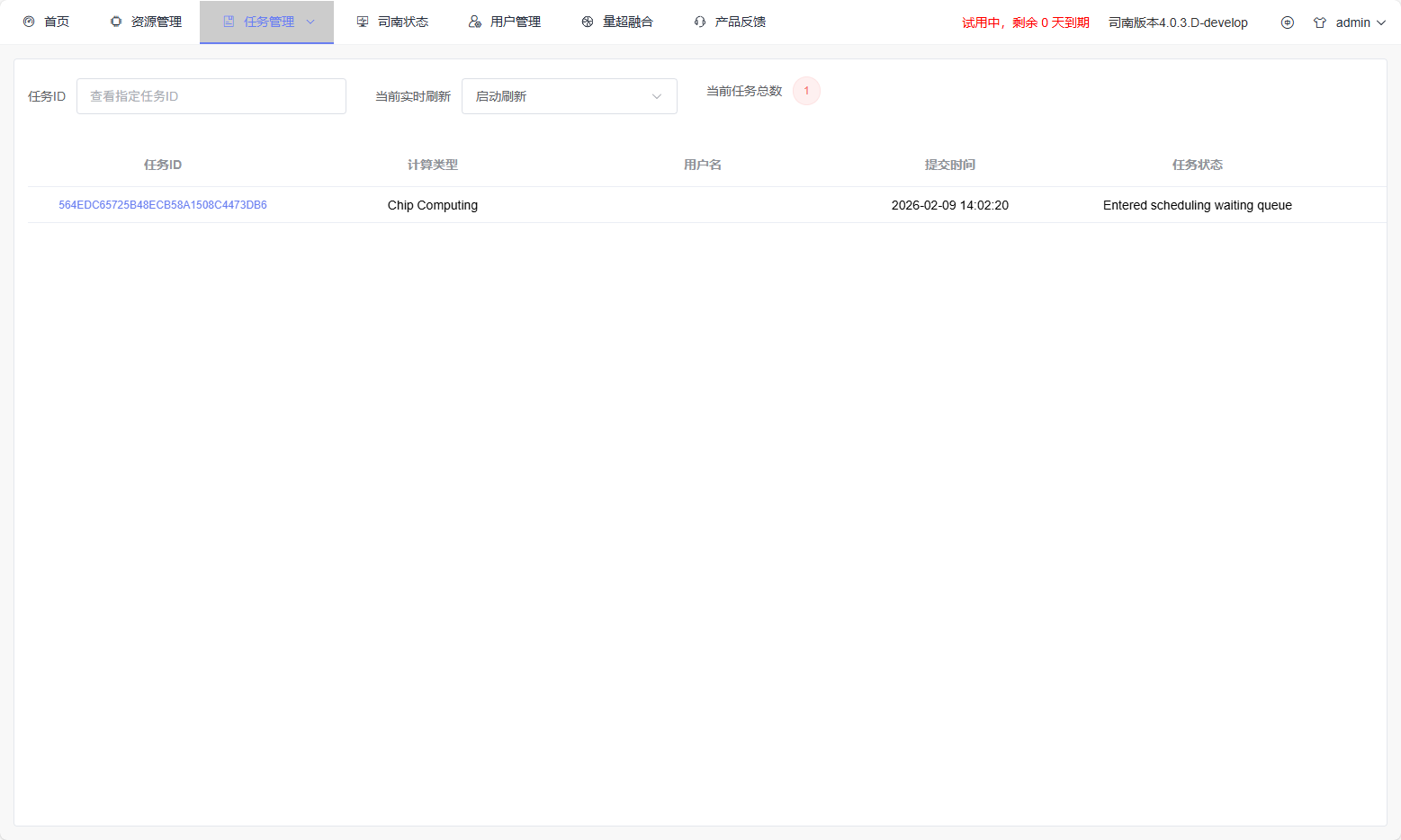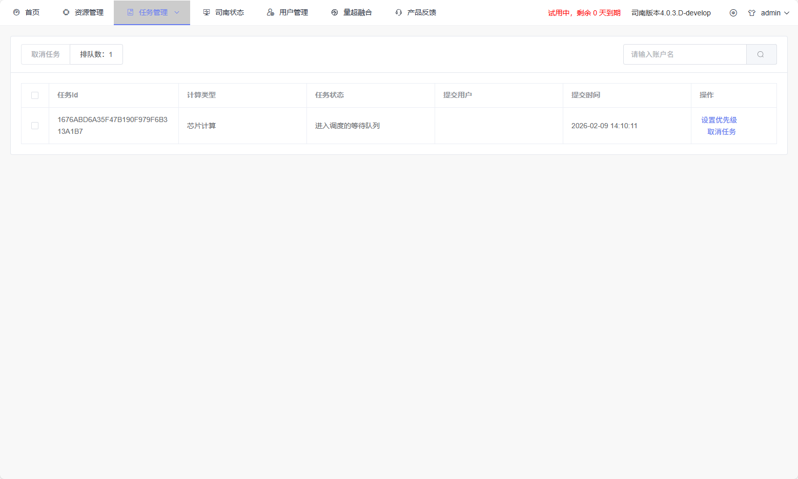 The user task management page is used to display and manage queued tasks submitted by users. Users can view their task queue on the backend and cancel their own tasks. Administrators can manage tasks from all users.