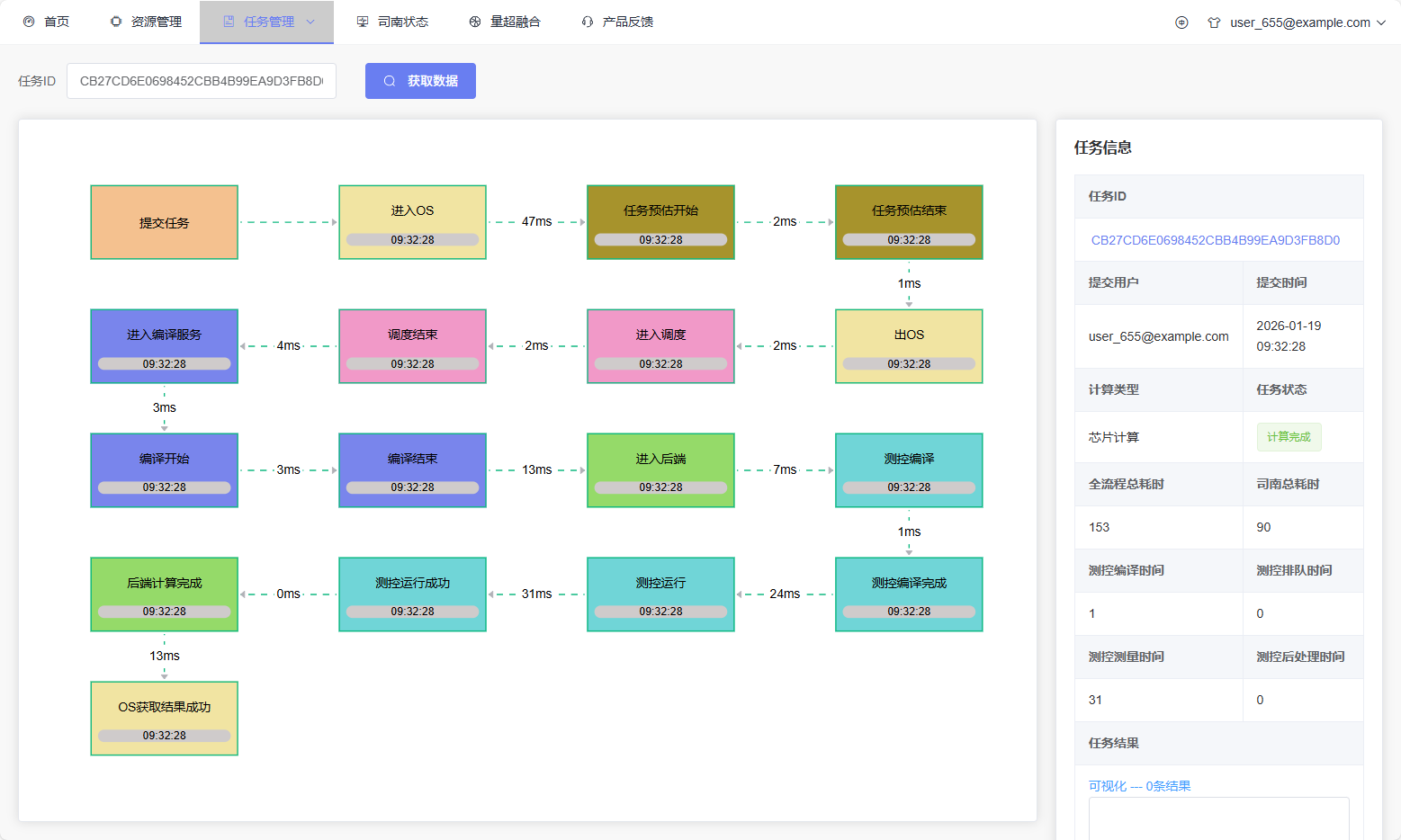 Task Information Module (Right): Displays task details in card form, including: - Task ID (clickable to navigate to task submission page to view parameters); - Error information (if any); - Submitter; - Submission time; - Computation type (quantum chip or cluster computing); - Task status; - Total processing time, Pilot total time, and time consumption for each stage (compilation, queuing, measurement, post-processing, etc.); - Task results.