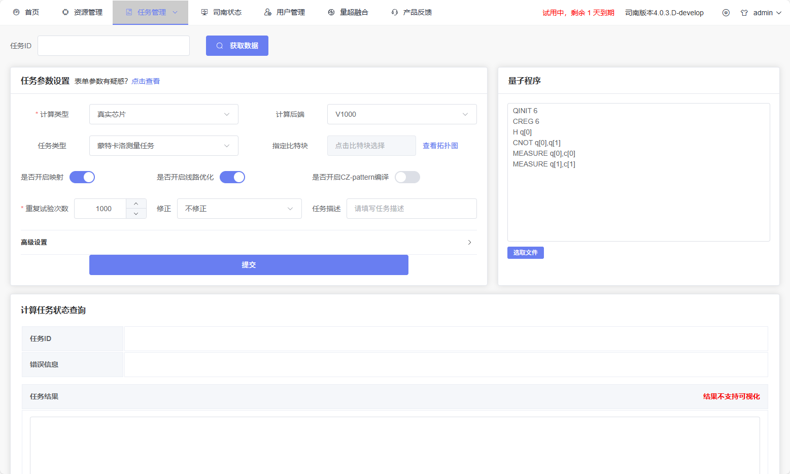 Function Overview: The task submission page is used to configure, submit, and view quantum computing tasks on the PilotOS platform, supporting both real quantum chips and simulator tasks. Users can select computation type, choose backend, configure parameters, upload or edit quantum programs (QProg), and view execution results.