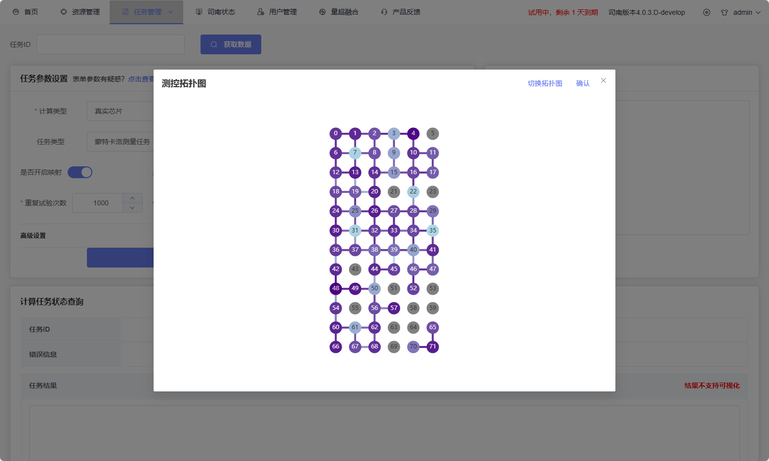 Chip Topology Dialog (Specified Qubit Block): When configuring specified qubit blocks, you can open the chip topology dialog to view the connection diagram and select or deselect physical qubit blocks.