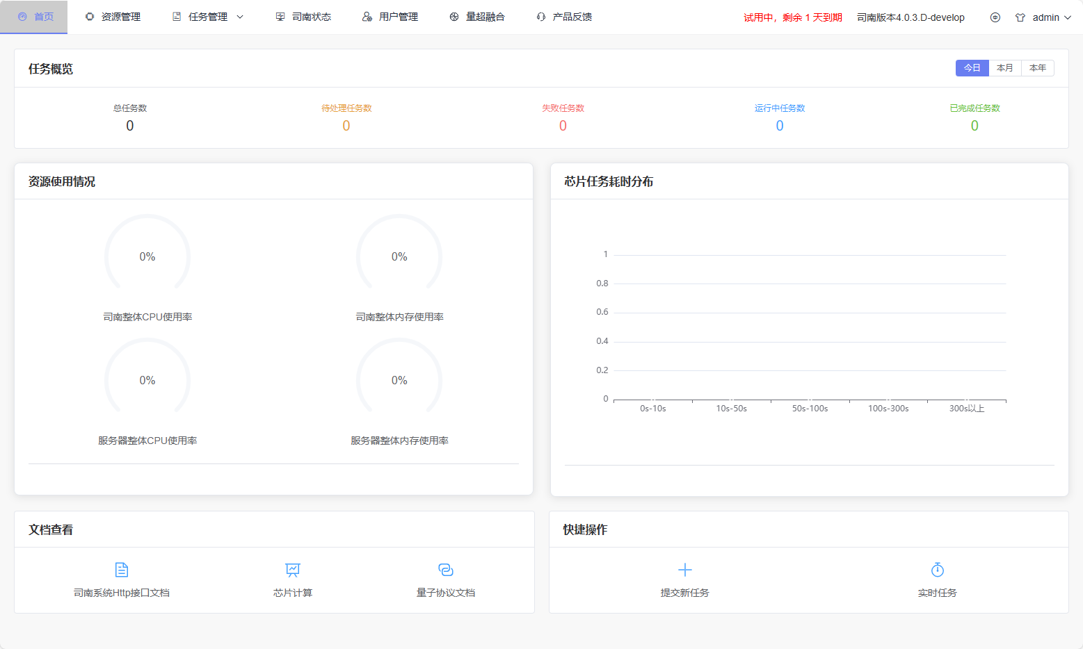 Page Overview: The Dashboard page serves as the comprehensive overview page for the Origin PilotOS Visual Management Console, displaying current task overview, resource usage, and chip task time distribution, while providing quick access to documentation and common operations.
